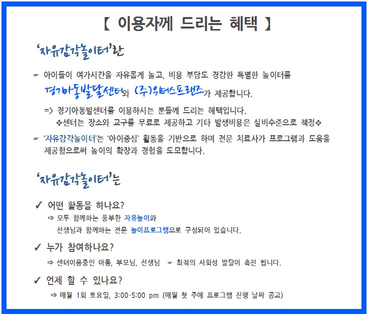 ¾ÆÀ̵éÀ» À§ÇÑ °æ±â¾Æµ¿¹ß´Þ¼¾ÅÍ ¿øÀå À̼±ÀÏÀÔ´Ï´Ù. °æ±â¾Æµ¿¹ß´Þ¼¾ÅÍ ÀÌ¿ëÀںе鿡°Ô ÇýÅÃÀ» µå¸®°íÀÚ ÀÚÀ¯°¨°¢³îÀÌÅ͸¦ °³¼³ÇÏ¿´½À´Ï´Ù. ¼¾ÅÍ´Â Àå¼Ò¿Í ±³±¸¸¦ ¹«·á·Î ³ª´®À» ÇÏ°í ¼±»ý´ÔµéÀº ÃÖ¼Ò ½Çºñ¿ëÀ¸·Î ¿î¿µÇÏ´Â ÇÁ·Î±×·¥ÀÔ´Ï´Ù. ![]() |